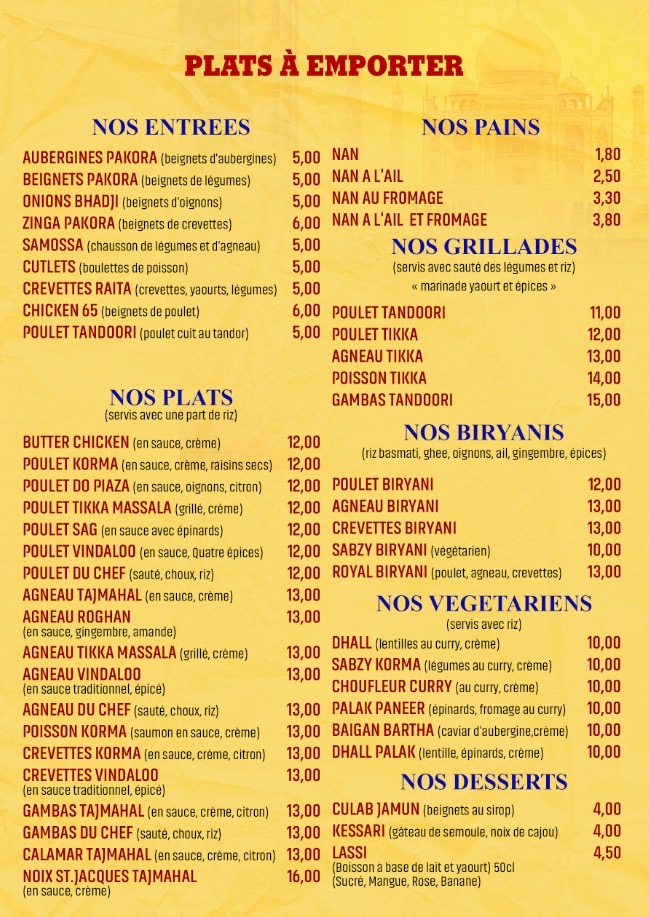 Sur place ou à emporter, le Taj Mahal, restaurant à Niort vous accueille dans une ambiance chaleureuse et conviviale. Idéale pour découvrir la richesse de la gastronomie indienne.